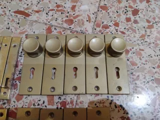 Conjunto de pomos y cerraduras para puertas, con un acabado dorado.