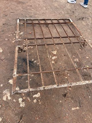 Reja antigua de hierro forjado, ideal para proyectos de restauración o decoración. - Fabricada en hierro. - Diseño robusto y clásico. - Presenta signos de óxido, propios de su antigüedad. - Sus medidas son 1,97 X 1,42