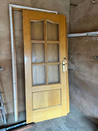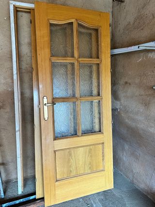 Puerta de madera de roble con detalles de cristal. - Diseño clásico con paneles. - Marco de madera incluido. - Tirador metálico.