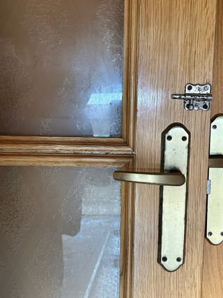 Conjunto de dos puertas de madera con detalles de cristal. - Acabado en madera clara. - Una puerta tiene un panel de cristal grande y la otra uno más estrecho. - Tiradores dorados. -En total 3 puertas -Hechas por un carpintero -Bien cuidadas