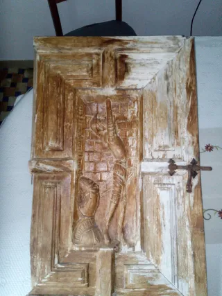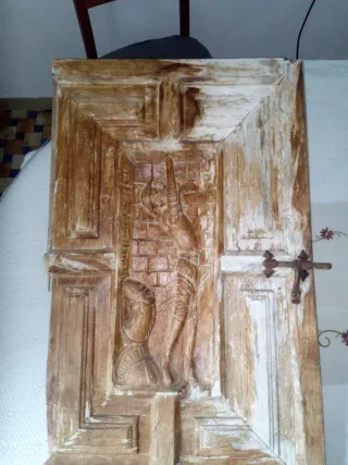 Detalle de puerta tallada en madera con un diseño intrincado. Don Quijote de la Mancha. Con cerrojo muy antiguo. Para restaurar o usar como decoración. Medidas: - 69 cm de alto. - 43 cm de ancho. - 2'8 cm de grosor. - Elaborado relieve. - Aspecto rústico y envejecido. Con muchos signos de desgaste de estar en un trastero. Puedo enviar.