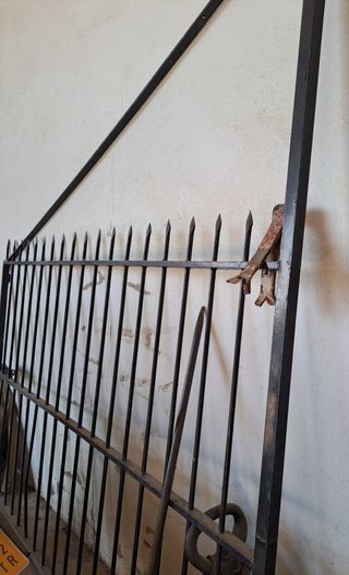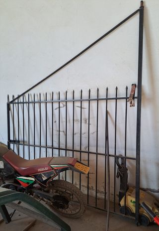 Preciosa puerta de hierro macizo forjado, ideal para una finca o chalet. Se encuentra en buen estado, lista para instalar. Son dos Hojas de 2.40 cm de ancha cada una Tiene 2.60 cm de alto por la zona mas alta y 1.60 cm aprox por la zona mas baja. Tiene los ganchos para agarrar a la pared, cerrojo par el suelo cada una de ellas y otro cerrojo para enganchar las dos puertas. - Fabricada en hierro macizo. - Diseño clásico y elegante. - Perfecta para entrada principal.