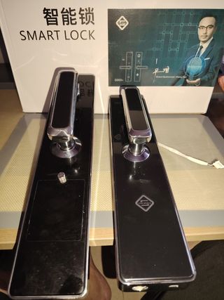 Cerradura inteligente de diseño moderno y elegante con wifi integrado. - Acabado en color negro brillante. - Panel frontal con pantalla táctil. - Incluye manija plateada.