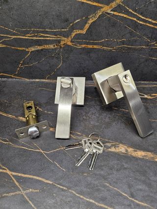 Dos manillas para puerta de la marca URFIc, en color plata. Son nuevas y vienen en su embalaje original. Una está abierta pero completa, la probamos pero no nos encajaba. Dispone de un muelle de recuperación que devuelve la manilla a su posición horizontal. La longitud del picaporte es de 110 mm. Los tornillos tienen una longitud de 20 mm. No dispone de orificio de perforación. Este modelo incluye 1 conjunto de 2 picaportes, además de los accesorios necesarios para su instalación: cuadrada y tornillos. Solo venta durante vacaciones escolares.