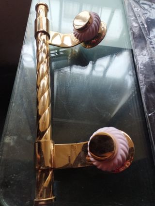 Elegante tirador de puerta con un diseño clásico y acabado dorado brillante. El pomo tiene un detalle en color lila. - Material: Metal dorado y pomo de cerámica. - Diseño: Tirador con barra retorcida y pomo decorativo.
