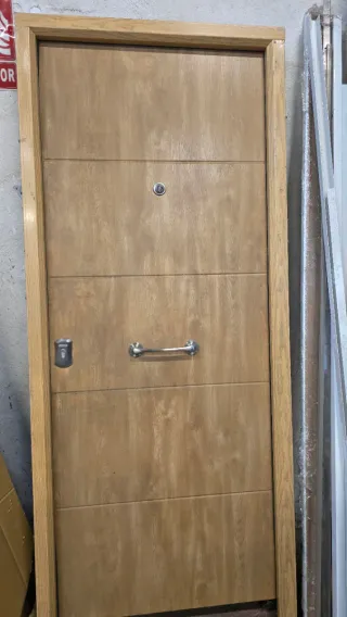 Puerta de entrada con acabado que imita la madera. - Diseño moderno con líneas horizontales. - Incluye cerradura y manilla metálica.
