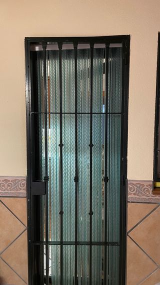 Reja de seguridad metálica para puerta. - Diseño con barrotes verticales. - Acabado en color negro. Hecha en hierro mazizo 2,10 x ,75 cm Con cerradura