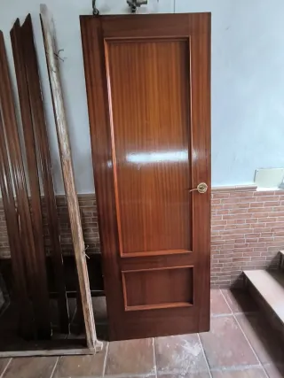 Puerta de madera para interior, con un diseño clásico y elegante. Modelo:(construcción con moldura) - Material: madera (chapa natural) - Color: Marrón oscuro(Sapely) - Acabado: barnizado - Incluye manilla con placa. 3 und pernios picaporte tubular. -Color dorado 10 unidades disponibles. preguntar manos de apertura. incluyen marcos y tapajuntas. 30€ por unidad completa (puerta,galce,tapajuntas y herrajes)