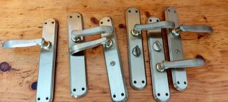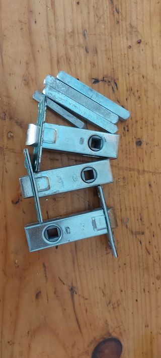 Lote de 6 manivelas para puertas de paso. 2 juegos de manivelas son con pestillo y 1 juego de manivelas es normal sin pestillo. En total son 3 manivelas. Medida entre agujeros derecha e izquierda 2,5cm Medida entre agujeros arriba y abajo 21,5cm. Medida total de la manivela alto 25,5cm ancho 4,5cm Leroy Merlin, Bricodeport, Lidl, Alcampo, aldi.