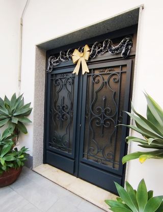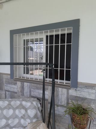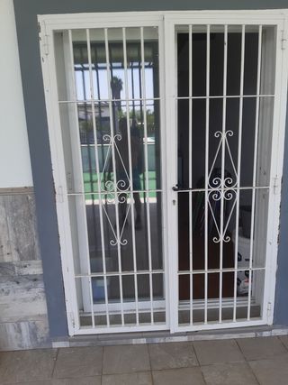 Reja de seguridad para puerta, fabricada en hierro forjado con un diseño clásico y elegante. Ideal para añadir protección y estilo a tu hogar. - Material: Hierro forjado. - Color: Negro. - Diseño: Barrotes verticales con adornos. - Cierre: Doble puerta con cerradura central. 4x Poertas 240x190 2x Ventana 127x100 1x Ventana 230x127 Precio 800€ todos