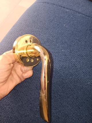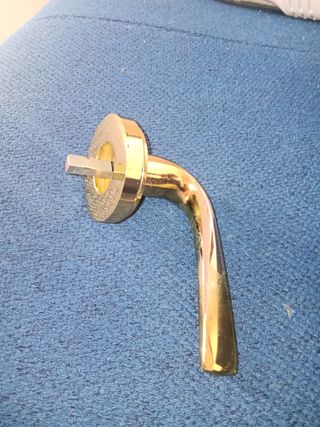 Pongo a la venta esta manilla de puerta. Es de color dorado y tiene un diseño elegante y curvado. - Manilla para puerta interior. - Acabado dorado brillante. - Diseño curvado y estilizado.