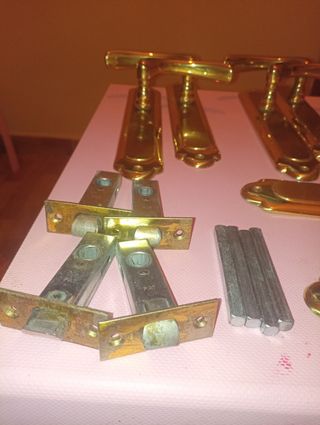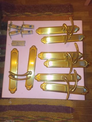 Juego de cuatro manijas de puerta doradas de estilo clásico. Son ideales para dar un toque elegante a cualquier puerta. - Cuatro manivelas completas, incluyendo pestillos. - Acabado dorado brillante y reluciente. - Diseño clásico y atemporal. - En muy buen estado, alguna con algún rallón típico del uso - De buenísima calidad ,costaron 25 euros cada juego