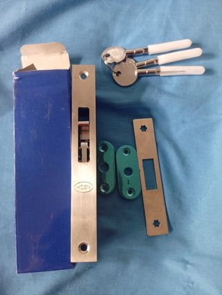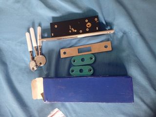 Cerradura para puerta, nueva a estrenar. Incluye tres llaves y todos los componentes para su instalación. El mecanismo parece robusto y de buena calidad. - Cerradura de metal. - Tres llaves incluidas. - Componentes de instalación incluidos. Interesados Gracias