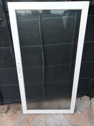 puerta de aluminio con cristal opaco con marco, esta muy bien cuidada