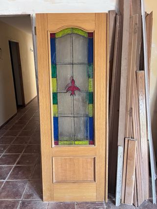 Preciosas puertas de madera maciza para habitación. Se venden 3 unidades y una doble con cristal. Son 60€ cada una de las macizas sin cristal. Serían 150 € las 3 juntas. Y 140€ la doble. Están en buen estado, listas para instalar. - Madera de roble. - Diseño clásico y elegante. - Incluye manilla. - 2 puertas con cristal emplomado.