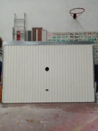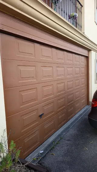 Puerta de garaje de color marrón, con un diseño seccional. - Diseño seccional. - Color marrón. - Motor prácticamente nuevo - Medidas: 4.7m ancho, 2.5 alto - Funciona perfectamente