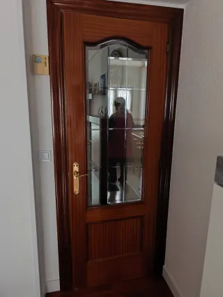 Precio unitario. Puertas de madera maciza, algunas con detalles de cristal. Disponibles 6 normales y 3 con cristal. - Diseño clásico con paneles de madera. - Cristales con motivos decorativos. - Tiradores dorados. Las que tiene cristal son de 202x73cm (de esas hay tres). Las normales hay dos medidas: 2 de 202x73 2 de 202x62