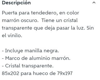Puerta para tendedero en color marrón oscuro con cristal transparente que deja pasar la luz. - Incluye manilla negra. - Marco de aluminio marrón. - Cristal transparente. - Medidas: 85x202 cm (para hueco de 79x197 cm).