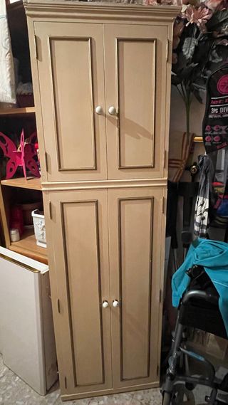 Armario de dos cuerpos con puertas, ideal para almacenamiento. - Diseño clásico en color beige. - Tiradores redondos blancos. - Acabado con detalles dorados en los marcos.
