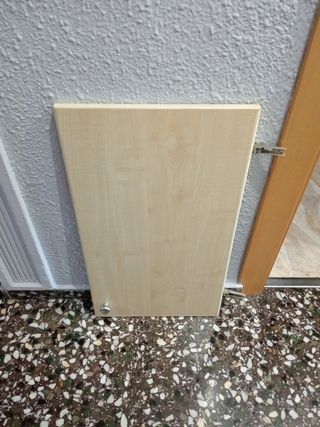 Se venden puertas de cocina de madera con un acabado claro y natural. - Diseño sencillo y elegante. - Tirador metálico incluido. - Bisagras metálicas visibles.