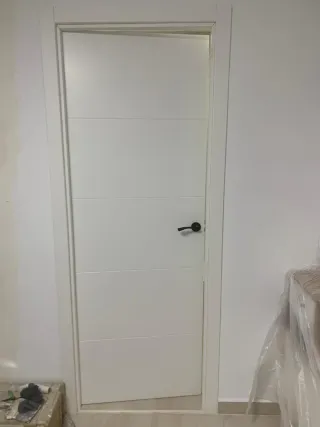 Puerta de paso interior de diseño moderno, acabada en blanco. De 80cm de ancha. - Diseño con cuatro paneles horizontales. - Esta en su envtorio original