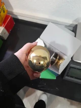 Pomo de puerta con acabado dorado brillante. Diseño esférico. - Material: Metal - Color: Dorado Incluye todo para su instalación Precio 5e no negociable No realizamos envíos estamos ubicados en puerto de sagunto