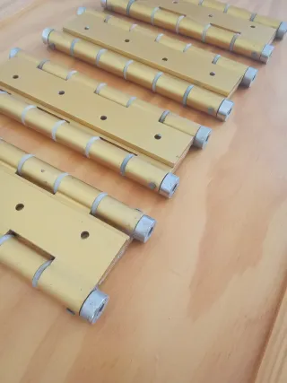 Conjunto de bisagras de doble acción en color dorado. Se encuentran en buen estado y con poco uso. - Material: Aluminio - Color: Dorado - Tipo: Doble acción