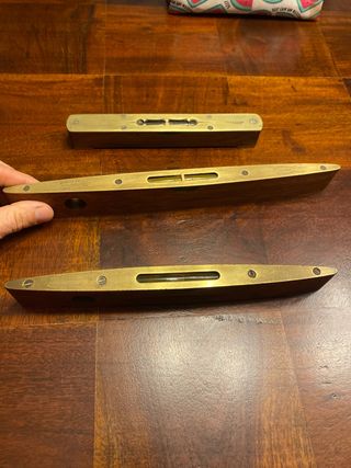 Nivel de carpintero antiguo de latón y madera. - Fabricado por J.Rabone & Son. - Cuerpo de madera con detalles en latón. - Burbuja de nivel visible. - Precio por unidad