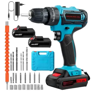 Taladro Percutor a Bateria 21V, Taladro Atornillador Bateria con 2 Baterías 2000mAh, 32Nm, 25+3 Ajuste de Par Destornillador Electrico, 24 Accesorios, 2 Velocidad, LED Luz Para Hogar, Bricolaje