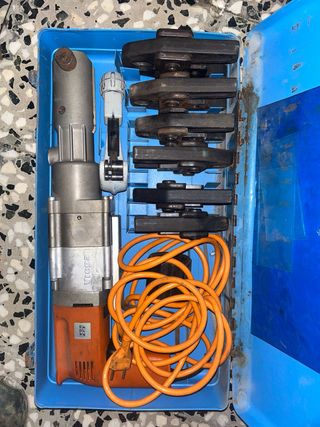 Se vende prensa eléctrica Viega en su maletín azul. Incluye varios cabezales de diferentes tamaños. - Prensa eléctrica con cable de alimentación. - Maletín de transporte azul. - Juego de cabezales de prensado.