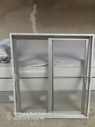 Ventana corredera con marco de aluminio y vidrio texturizado. - Marco de aluminio. - Vidrio texturizado. Está algo sucio por obra, está perfectamente.