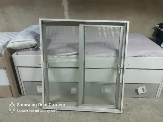 Ventana corredera de aluminio con vidrio texturizado. - Medidas: 110 cm de alto por 100 cm de ancho. - Marco de aluminio. - Vidrio texturizado.