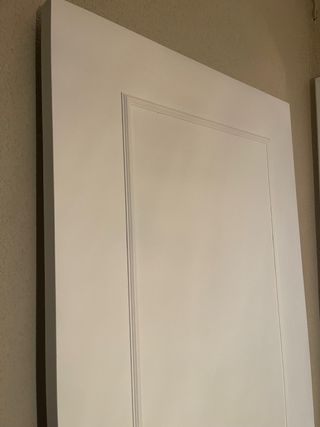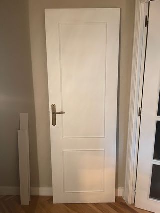 Puerta interior lacada en blanco con un diseño clásico de molduras. -69 x 200 cm - Acabado liso y uniforme. - Diseño de dos paneles. - Tirador metálico incluido.