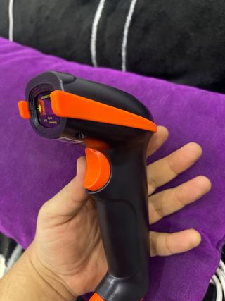Pistola escáner láser con conexión USB. Diseño ergonómico en color negro y naranja. - Cable USB de alta velocidad incluido. - Gatillo de color naranja. - Base y detalles en color naranja.