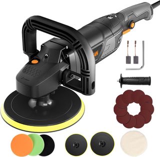 Pulidora orbital AUTIWOZ de 920W, ideal para coches, barcos y motocicletas. Incluye mango en D y mango lateral. - 6 velocidades (2800-5800RPM). - Plato de pulido de 125 mm. - Incluye bolsa de transporte. - Incluye guantes.