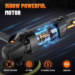 Pulidora Orbital Rotativa, Ligera y Potente, Motor de 1050 W, peso reducido de 2,2 kg y velocidad variable de 700 a 2500 RPM con arranque suave. Incorpora control de velocidad en el gatillo, diseño ergonómico, bloqueo de eje para cambiar el plato fácilmente y cable de 5 m para mayor alcance. Ideal para trabajos de pulido automotriz profesional. Diseñada para un acabado impecable. Pulidora eléctrica regulable - Color negro y gris. - Disco de pulido incluido.