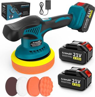 Pulidora orbital inalámbrica para coche, ideal para el cuidado de detalles del automóvil. Incluye dos baterías de 21V 2.0 Ah. - 8 velocidades variables (2800-6000 RPM). - Kit de 21 piezas. - Incluye delantal, guantes, cargador y bolsa de transporte.