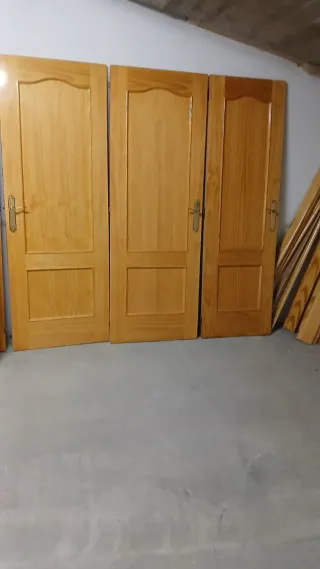 Se venden puertas de madera de un piso completo. Son de color miel y tienen un diseño clásico. Precio negociable - Puertas de madera maciza. - Diseño con paneles. - Tiradores dorados.