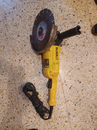 Amoladora radial de la marca DeWalt, ideal para trabajos de corte y desbaste. Se encuentra en su maletín original. - Mango auxiliar. - Llave de ajuste. - Disco de corte.