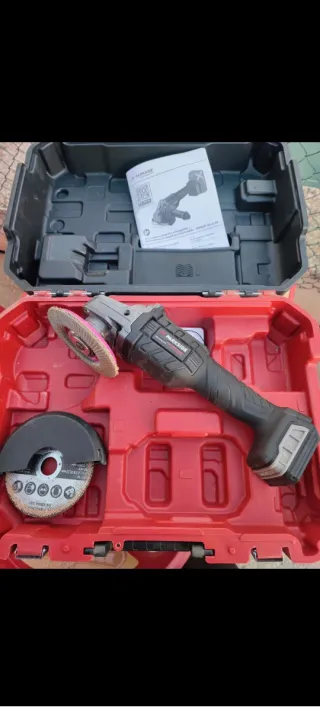 Radial amoladora Parkside en su maletín de transporte. -Sin estrenar - Incluye disco de corte. - Protector de disco. - Empuñadura auxiliar. - Maletín rígido rojo y negro. Se le puede poner bateria de 20v o 40v (no la trae)