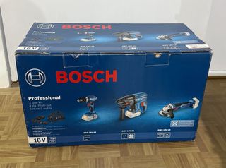 Kit profesional Bosch de 3 herramientas a batería de 18V. - Taladro percutor GSB 18V-45. - Martillo GBH 18V-21. - Amoladora GWS 18V-10.