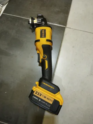 Amoladora radial inalámbrica de la marca WZTO, ideal para trabajos de corte y desbaste. - Voltaje de la batería: 21V. - Compatible con discos de 115mm y 125mm. - Diseño ergonómico para un agarre cómodo. - Incluye batería y cargador.