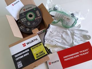 #025 Nuevo. Lote de 50 discos de corte Wurth amoladora radial de 115 x 1mm para corte de materiales duros !! Se añade también al set unas gafas de seguridad protección y unos guantes de piel. Todo marca Wurth fabricante Alemán material profesional. Envíos paqueteria urgente 24h. Lo que se muestra en las fotos.