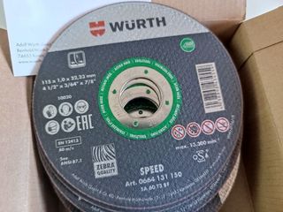 #278 Nuevo. Lote de 137 discos de corte Wurth amoladora radial de 115mm variados, para corte de materiales duros !! -1 caja de 100discos. -1 caja de 25 discos. -12 discos sueltos. Todo marca Wurth fabricante Alemán material profesional. Envíos paqueteria urgente 24h. Lo que se muestra en las fotos.