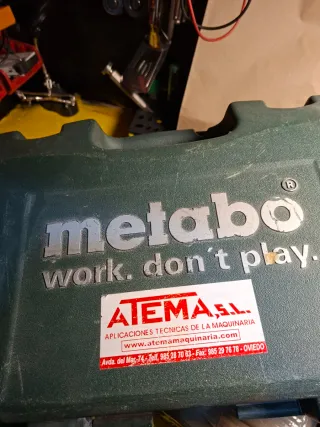 Radial de la marca Metabo. - Modelo: work. don't play. - Incluye etiqueta de ATEMA, S.L. con datos de contacto y página web.