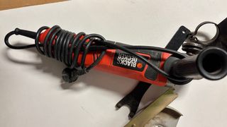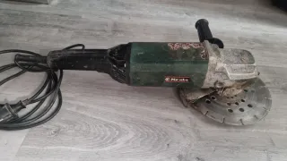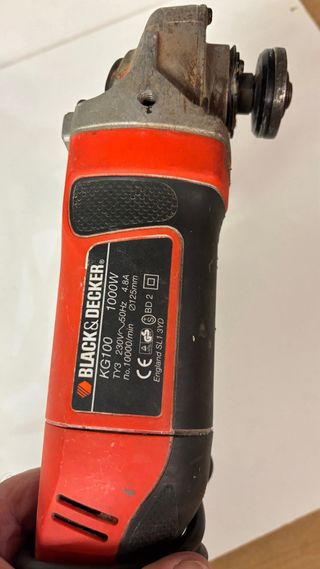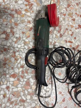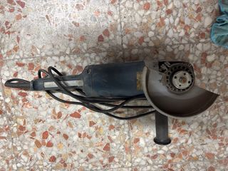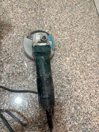 Herramienta de corte con disco circular. - Mango auxiliar para mejor agarre. - Protector de disco metálico. Funciona perfectamente pero visualmente está desgastada y tiene empalmes en el cableado.
