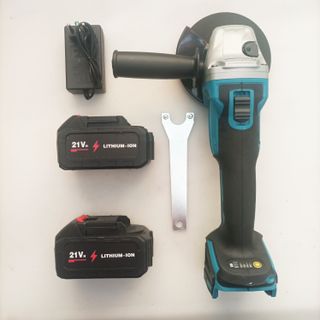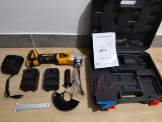 Amoladora con dos baterías y maletín de transporte. - Incluye dos baterías de 21V Li-Ion. - Cargador de batería. - Maletín rígido para almacenamiento y transporte. - Herramienta de corte compacta y portátil.