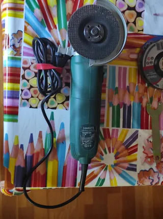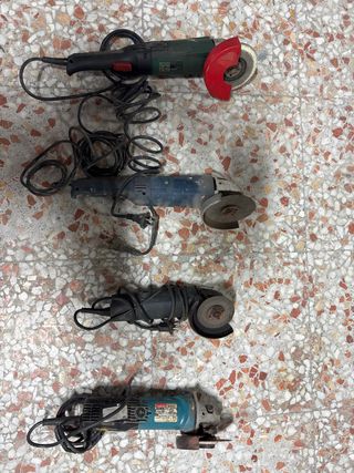 Se venden por separado . 12€ la unidad cuatro amoladoras angulares de diferentes marcas y modelos. Ideales para trabajos de corte y desbaste. - Amoladora verde con disco rojo. - Amoladora azul. - Amoladora negra. - Amoladora azul claro con etiqueta.