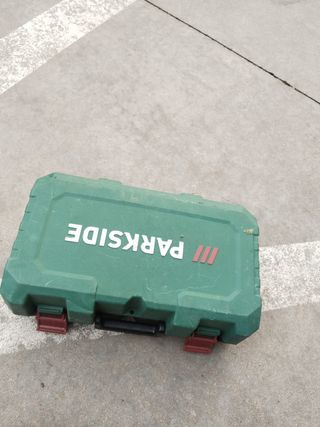 Radial Parkside en su maletín de transporte. - Incluye disco. - Mango auxiliar. - Maletín verde y negro.