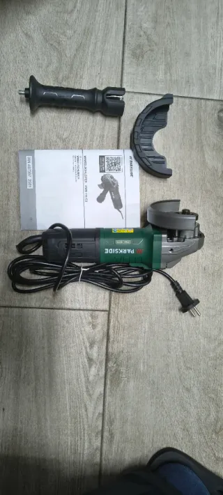 Amoladora radial de la marca Parkside. Incluye accesorios. - Mango auxiliar. - Protector de disco. - Manual de instrucciones.